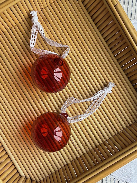 Franske store julekugler i rødt glas med vintage broderi anglaise bånd
