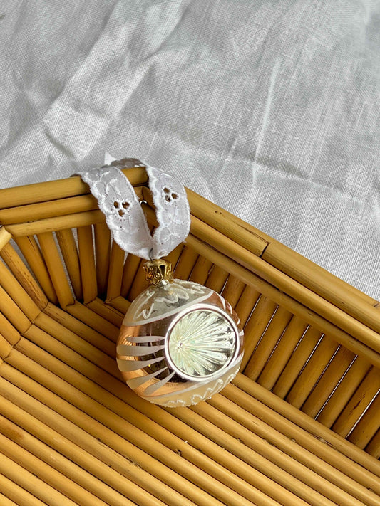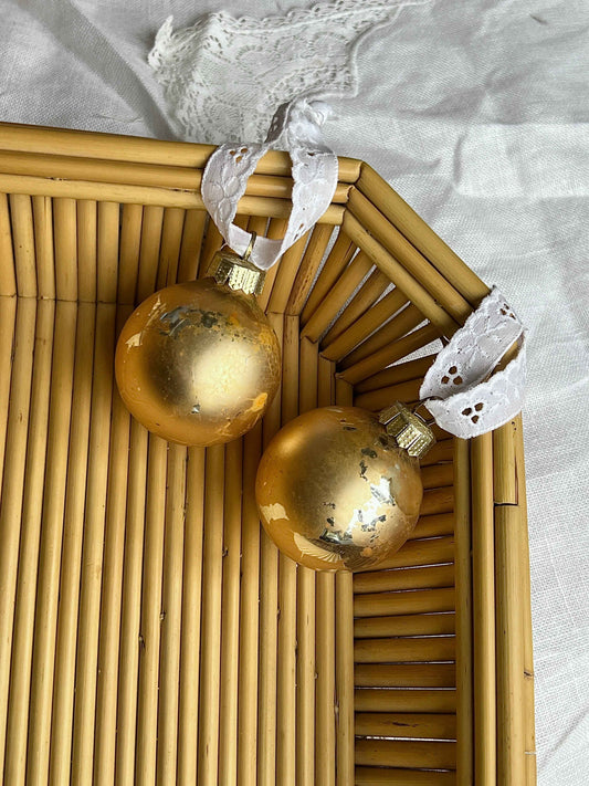 Franske julekugler i gyldent glas med vintage broderi anglaise bånd